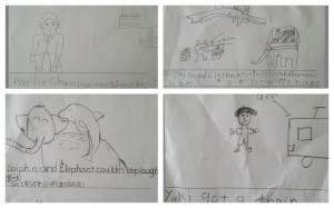 これまで習ったフレーズや単語を組み合わせて、自分たちで新たに文章をつくりました。こちらもた面白くってこどもたちの想像力に感心させられます。
